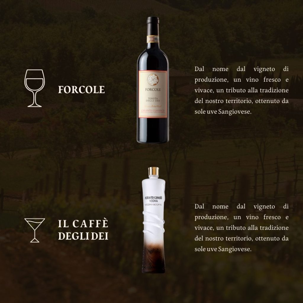 Un percorso tra piatti della nostra cucina, grandi vini e cocktail d’autore realizzati con i distillati della Tenuta: un incontro tra eleganza, carattere e creatività.